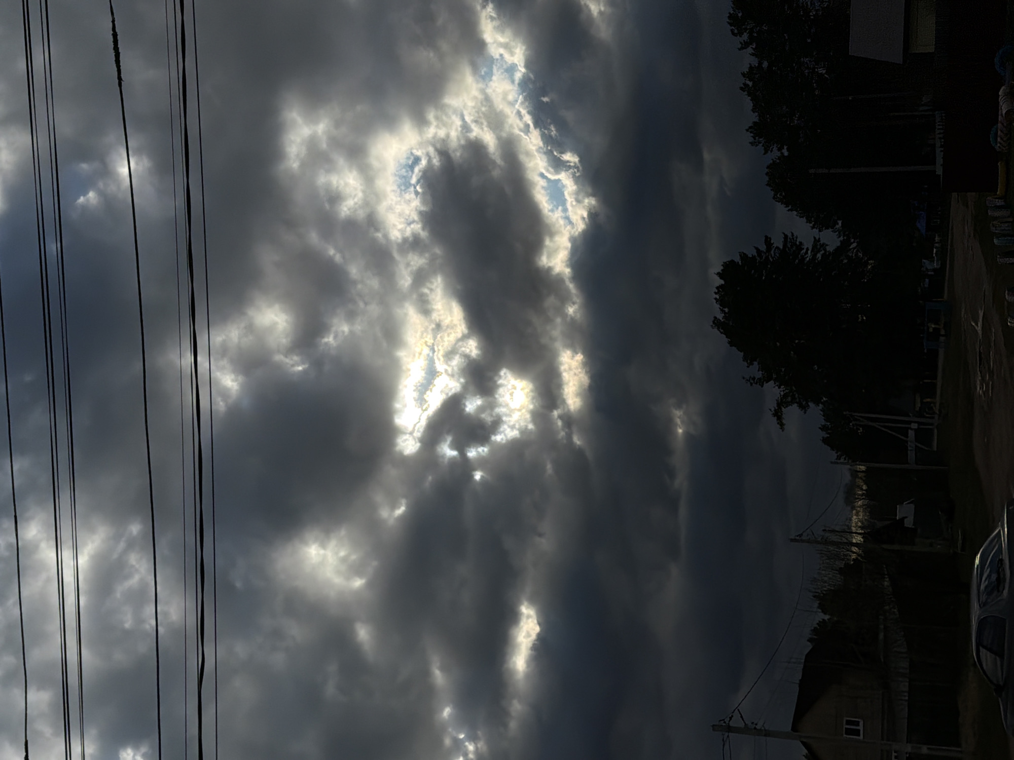 The image, likely taken in or near Rusalevka, Russia, shows a sky filled with dark, ominous clouds. Some clouds allow sunlight to penetrate, creating bright streaks. On the left are power lines running vertically. On the right, silhouetted trees, possibly a residential structure, and a partially visible vehicle are present. The overall scene suggests an overcast or stormy weather condition. No people are visible.
