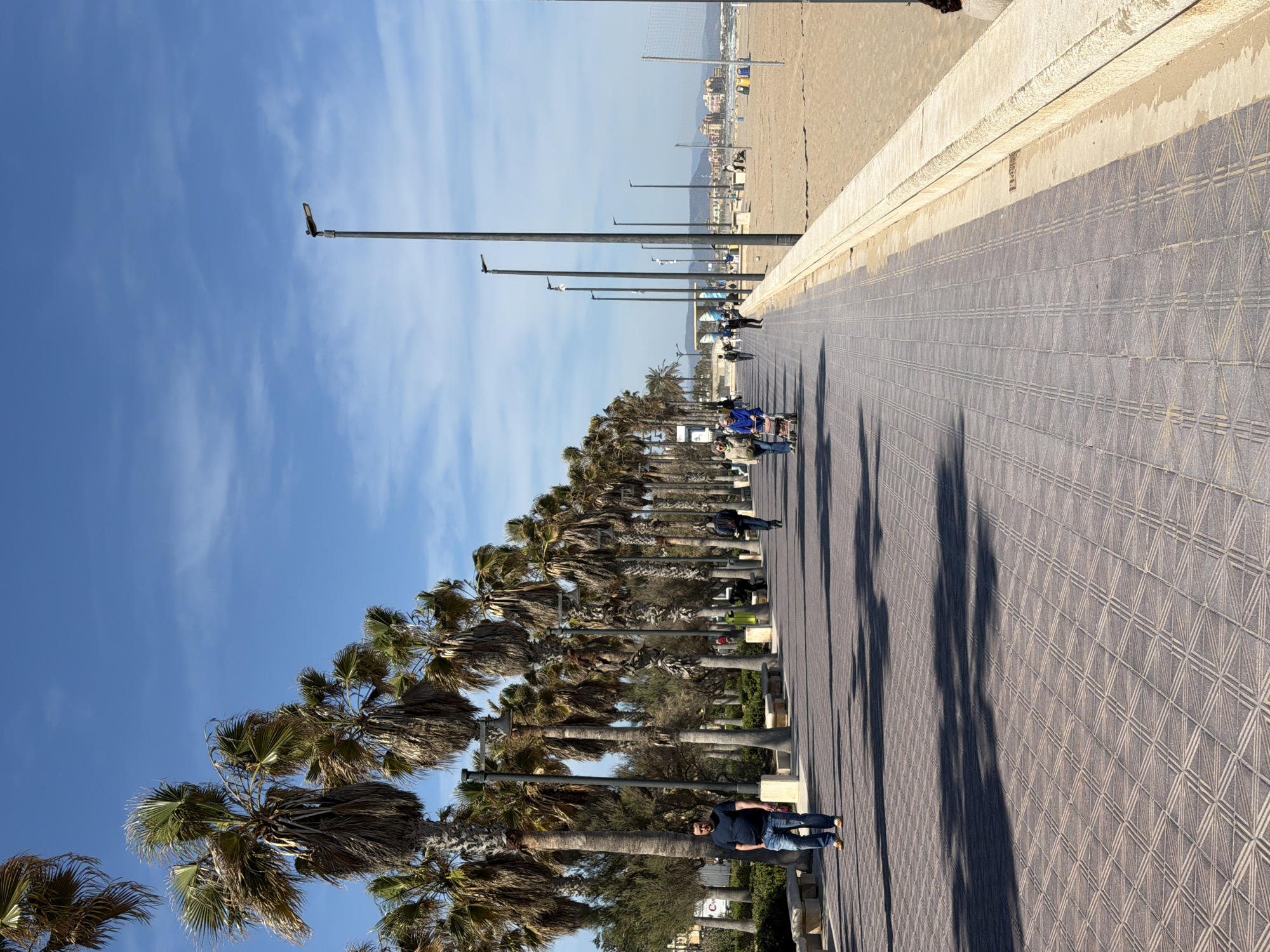 This image depicts a wide, tiled promenade running parallel to a sandy beach under a clear blue sky with scattered clouds, characteristic of a coastal area in Valencia, Spain. A long, dense row of mature palm trees lines the left side of the promenade, casting distinct shadows across the patterned, reddish-brown paving. Tall, dark-colored modern streetlights are uniformly spaced along the right edge of the promenade, which is separated from the beach by a low, light-colored stone wall. In the foreground, a male individual in a dark blue t-shirt and light blue jeans walks towards the viewer, with his hands in his pockets. Further down the promenade, another individual walks away from the viewer, carrying an item on their back. Closer to the mid-ground, two individuals are visible walking towards the viewer, one of whom is pushing a four-wheeled walking aid. Additional pedestrian figures are discernible in the distance along the promenade. Light-colored stone benches are placed intermittently beneath the palm trees. To the right of the promenade, a wide expanse of light-colored sand extends. A white volleyball net with posts is set up on the beach, near which yellow and blue trash bins are visible. Several small groups of people are present on the sand. In the far background, coastal buildings and distant mountains are visible under a slightly hazy sky.