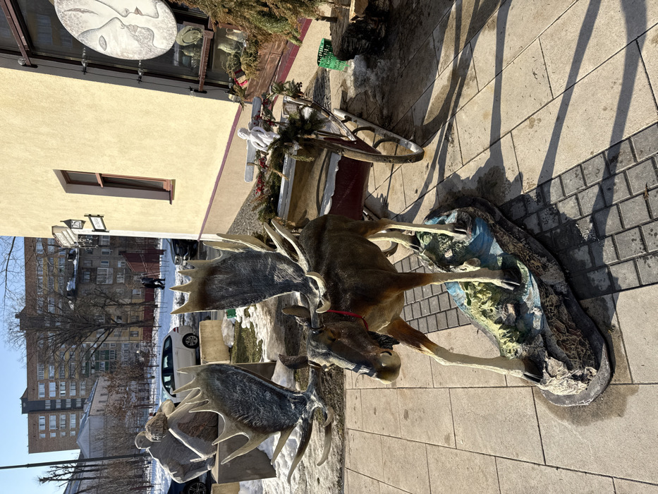 This image captures an outdoor scene on a city street in Minsk, Belarus, under clear daylight conditions, suggesting late winter or early spring with patches of snow present. In the foreground, a life-sized statue of a moose with large, textured antlers stands on a sculpted base, positioned on a paved sidewalk. The moose statue wears a red collar. To the right of the moose, adjacent to a light-yellow building, is a decorative wooden sleigh adorned with evergreen foliage, red berries, and a small white angelic figure. The building, displaying a street sign marked "25," features a brown-framed window and a large display window exhibiting a circular art piece depicting two faces in profile. To the left of the moose, partially obscured by snow, are two abstract stone sculptures. In the mid-ground, a street runs parallel to the sidewalk, where a white station wagon and other vehicles are parked. Two individuals are observed walking in the distant background. A multi-story brown apartment building is prominent in the far background, surrounded by bare trees. Strong sunlight illuminates the scene, creating distinct shadows on the paved surfaces.