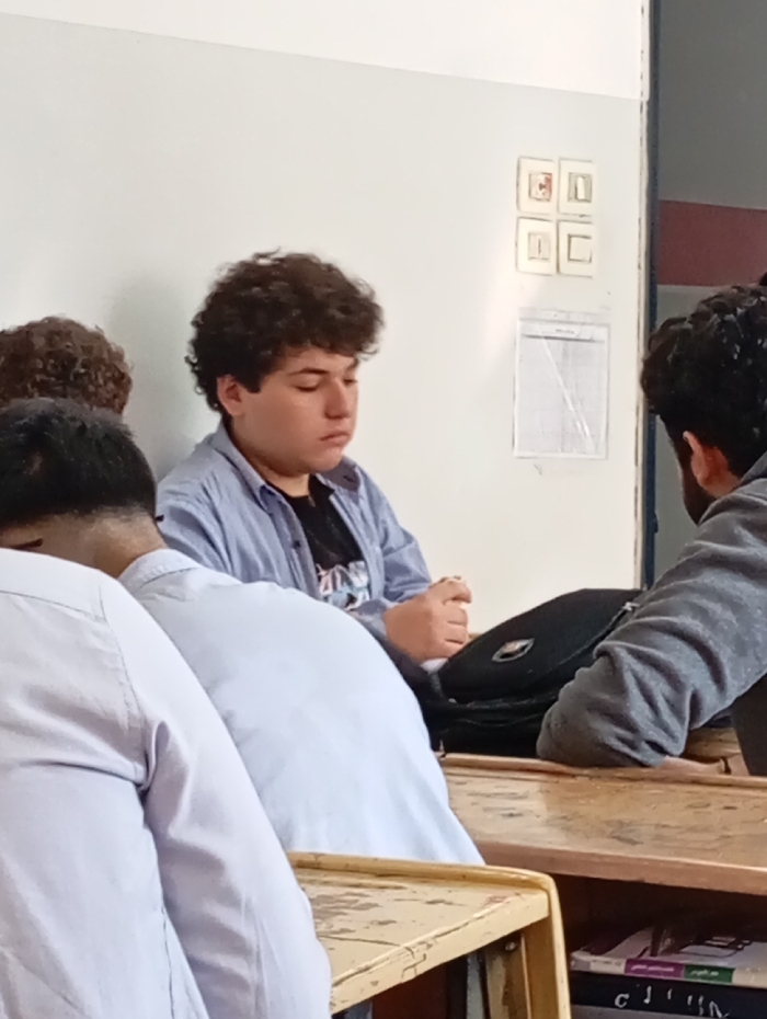 - "In a classroom setting, a young boy with curly brown hair sits at a desk, wearing a light blue button-down shirt over a dark t-shirt" by FM-uNgLB2, licensed under CC BY 4.0