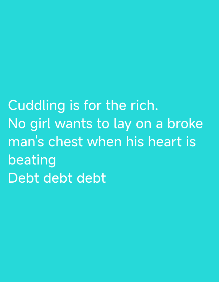 The image displays white sans-serif text centered horizontally on a solid teal background. No people, subjects, actions, or interactions are visually depicted. The environment is a digital screen or display located within the city of Unknown, Unknown. The text reads: "Cuddling is for the rich. No girl wants to lay on a broke man's chest when his heart is beating Debt debt debt".