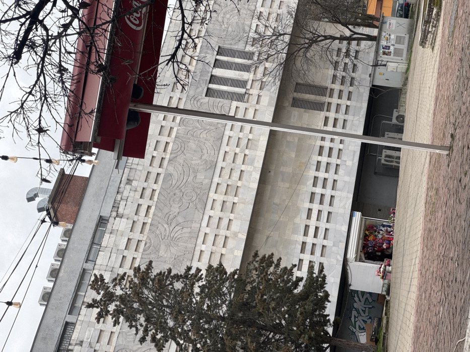 The image depicts an urban scene in Stara Zagora, Bulgaria, under an overcast sky. A large, multi-story building dominates the background, featuring a facade composed of light-colored marble or stone tiles. This facade includes horizontal bands of recessed rectangular elements and decorative panels with intricate, swirling relief patterns. The upper portion of the building is plain grey, with multiple air conditioning units and a brick chimney topped with metal ducting visible on the roofline. Several louvered windows are present on the building's mid-section. At the ground level of the building, a recessed, darker area is visible, partially obscured. A small, white, open-fronted kiosk is situated here, displaying items such as stuffed animals and potted plants. Graffiti is present on a wall to the left of the kiosk. In the foreground, a paved area constructed from reddish-brown interlocking pavers extends across the lower half of the frame. A tall, slender grey pole rises from this pavement, supporting a red awning with "Coca-Cola" branding visible on its underside. String lights with exposed bulbs are strung across wires overhead, suspended above the scene. Vegetation includes a mature conifer tree with dense, dark green foliage on the left side of the frame, and a bare deciduous tree with fine branches partially obscuring the red awning on the right. Several grey utility boxes are positioned on the right side of the paved area. A dark-colored car is partially visible parked in the background on the far right. No individuals are discernible within the frame.