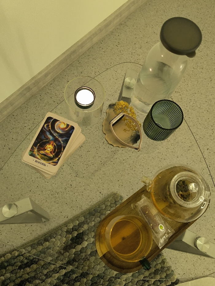 A glass table features a collection of items, including a stack of tarot cards, a lit candle in a glass holder, a decorative dish with a smart watch, and a ribbed green glass. A clear water bottle with a grey lid sits nearby. On a wooden tray, a glass teapot with tea leaves and a teacup with tea are displayed, alongside a sealed tea bag. A textured grey rug peeks out from under the tray.