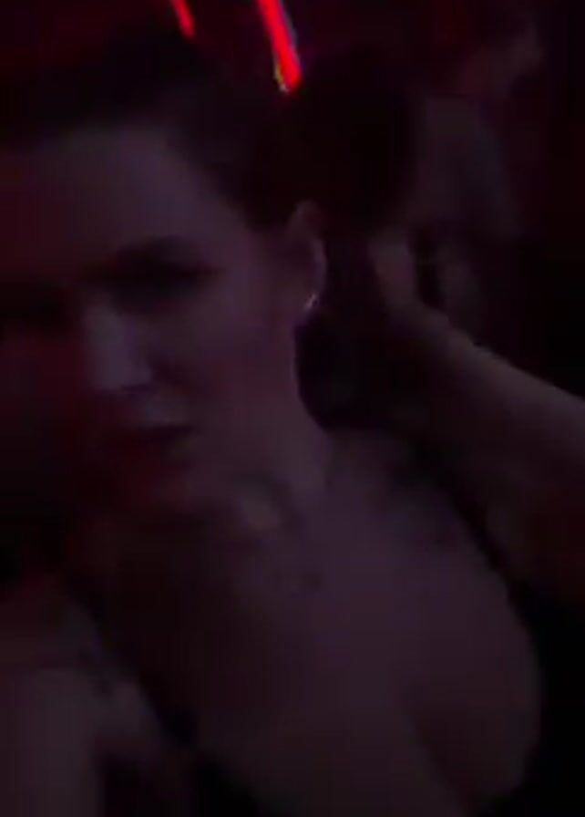 young woman in a club or party setting. She is wearing a dark top with thin straps and a necklace. The lighting is colorful and dynamic, changing between red, blue, and green. People are moving around her, though they are mostly out of focus. The woman looks into the camera and appears to be speaking, though the audio is muffled. The camera moves as she turns her head and possibly dances.