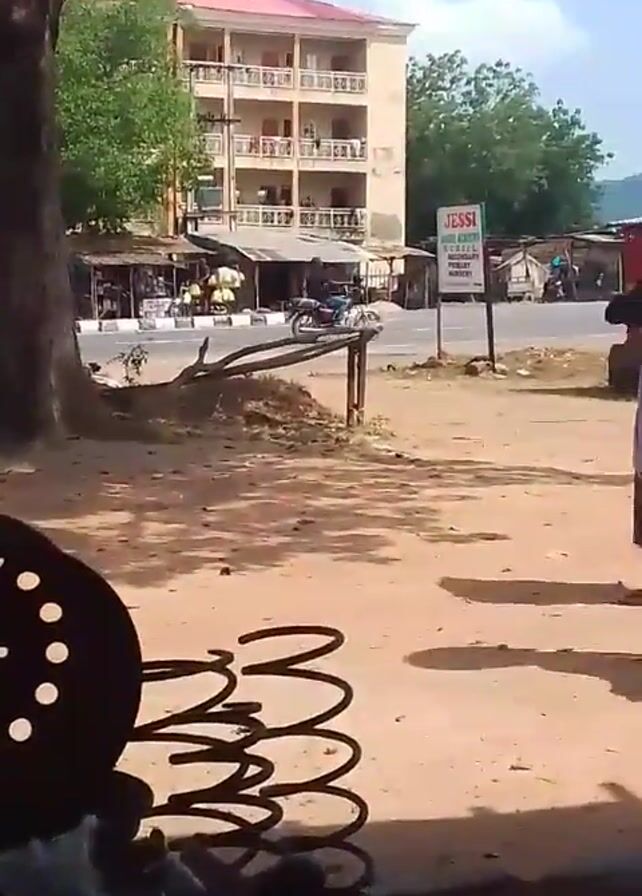 street scene in what appears to be a village or small town. The camera is positioned inside a structure that seems to be a shop or repair garage. In the foreground, there's a black wheel rim, some metal springs and other automotive parts. Outside, several women dressed in traditional Muslim attire walk by carrying items on their heads. Behind them, there's a dusty road with a motorcycle passing. In the background, there's a two-story building with a red roof, and a sign for "Jessi" that indicates a pharmacy nearby. The overall atmosphere is that of a typical day in a small, lively community.