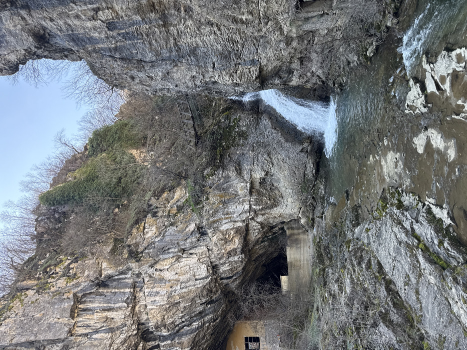 The image depicts a natural gorge or canyon in Lesicharka, Bulgaria, under clear daylight conditions. The scene is dominated by steep, rugged rock formations on both sides, with a river and a waterfall in the foreground. On the left, a massive, layered rock face shows variations in gray, white, and brown coloration. At its base, a large natural or excavated cavern opening is present, partially obscured by a concrete retaining wall or platform. To the far left, a small, dilapidated stone or concrete structure with an empty window frame is visible, appearing integrated into the rock face. Bare deciduous trees and sparse brush grow on the lower slopes and along the riverbed. The right side of the image features a similarly steep and rugged rock face, predominantly gray. A significant waterfall cascades from a higher elevation on this side, emptying into a greenish-blue pool that feeds the river. In the upper-middle section, spanning between the two rock faces, a rustic wooden footbridge with railings is suspended, appearing elevated above the water level. The cliffs above the bridge support sparse vegetation, including bare deciduous trees and some areas of dark green evergreen foliage. The river flows from the waterfall towards the foreground, exhibiting a rocky bed with areas of visible water flow and shallower, stagnant pools. The immediate riverbanks consist of exposed rock and sparse, low-lying vegetation. The sky above is clear and light blue. No individuals or animals are present within the frame.