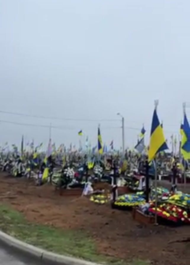 cemetery on a cloudy day. The graves are decorated with wooden crosses and Ukrainian flags. Many graves are adorned with colorful wreaths and flower arrangements. The ground around the graves appears to be mostly dirt. In the foreground is a narrow paved road or walkway. The overall impression is one of solemnity and respect for the deceased.