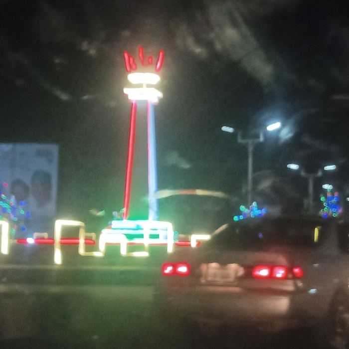 A blurry nighttime shot shows a brightly lit tower with red and white neon accents. The tower has a decorative top resembling flames or a crown. A car's rear lights are visible in the foreground, and decorative string lights adorn nearby structures. The scene appears to be a street at night with festive decorations. A billboard is partially visible to the left of the tower.