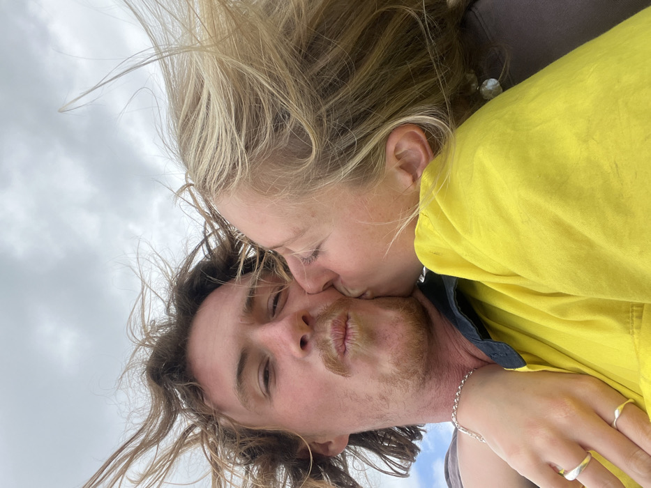 An upside-down selfie of a couple. A blonde woman in a yellow jacket kisses a man with brown hair and a mustache on the cheek. His eyes are open, and his lips are puckered. The sky is visible behind them. The woman wears a hair clip and a bracelet. The man has two rings on his hand. Their hair is blowing in the wind.