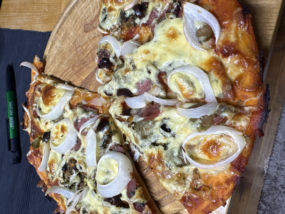 The image displays a partially consumed pizza resting on a round, light-brown wooden serving board. The pizza has a golden-brown crust with some darker, slightly charred areas. Toppings include melted, bubbly, golden-yellow cheese over a red sauce base, numerous translucent white onion rings, slices of reddish-pink cured meat, and dark, irregular pieces consistent with mushrooms or olives. Multiple slices remain on the board, indicating at least two slices have been removed. In the background, a dark, textured surface, presumably a tabletop, is visible. A dark green marker pen with a black cap is positioned horizontally on this surface, displaying the upside-down text "TAHTYM BEPAE". The scene is located in the city of Stefan Karadja, Bulgaria. No individuals are present.