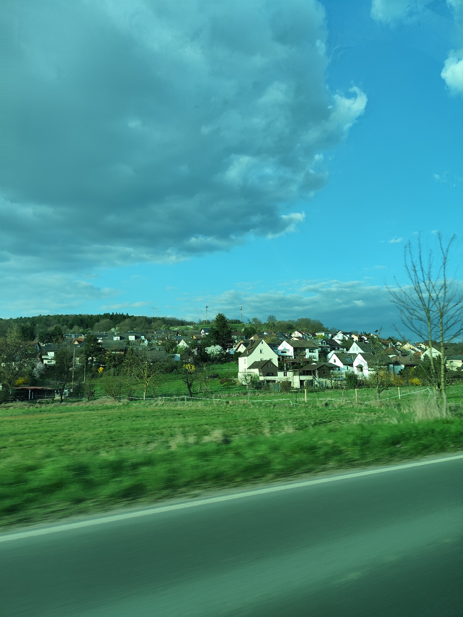 The image depicts a rural-residential landscape in Kleinwallstadt, Germany, viewed from a moving vehicle. In the immediate foreground, a dark asphalt road with a faded white shoulder line traverses the lower right, exhibiting motion blur. To the left of the road, a strip of vibrant green grass shows significant motion blur, suggesting a rapid forward movement. The midground features a village situated on a gentle hillside. Numerous detached two-story houses are visible, predominantly with light-colored (white, cream, pale pink) facades and dark, possibly tiled, roofs. These houses are interspersed among patches of green grass, some fenced areas, and a variety of trees. Several deciduous trees appear bare, while others display early spring blossoms in white and yellow. A small, single-story brown structure is discernible on the far left. The background consists of a dense, dark green forest line crowning the hill behind the village. Above the village on the right, a tall, slender mast, possibly a communication tower, stands against the sky. The sky is divided, with heavy, dark teal-grey clouds occupying the upper left quadrant and a clear, vibrant blue sky with scattered white clouds dominating the upper right. No individuals or specific actions are discernible. The scene is illuminated by natural daylight.