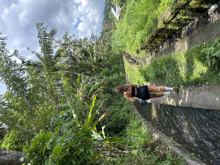 An individual is depicted walking away from the viewer on a narrow concrete path in the city of Sangkan Gunung, Indonesia. The path runs parallel to a concrete irrigation canal containing dark, flowing water on the left. The individual, appearing female, wears a black crop top, black shorts, white socks, and white athletic shoes, carrying a small black shoulder bag. Lush, dense tropical vegetation, including large-leafed plants and palm trees, borders the left side of the path and canal. To the right of the path, a second, wider channel appears largely dry, beyond which extend vibrant green rice paddies. In the far background right, a small structure with a light-colored gabled roof is visible within the green landscape. The sky is partly cloudy with patches of blue visible.