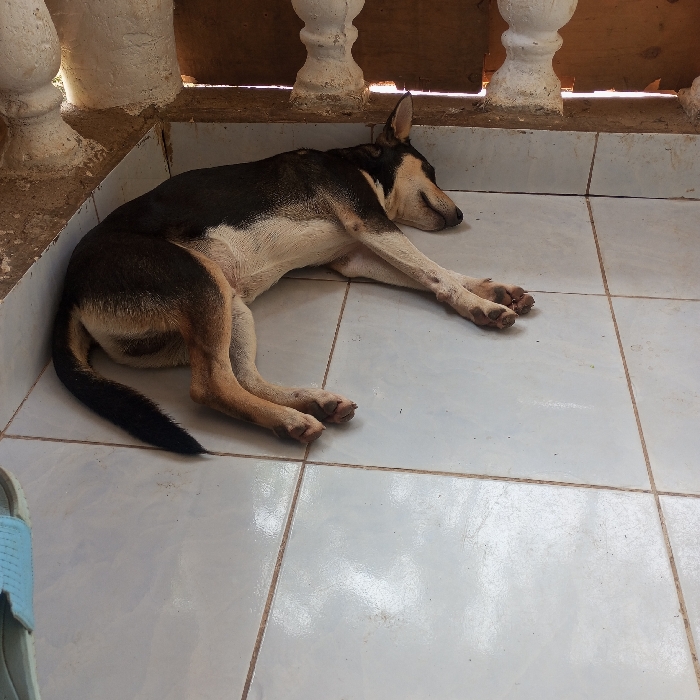 - "The image depicts a bi-colored dog, predominantly black on its back and head, with white fur on its underside and legs, and tan accents on its legs and face, lying asleep on a tiled floor" by FM-iEAFO2, licensed under CC BY 4.0