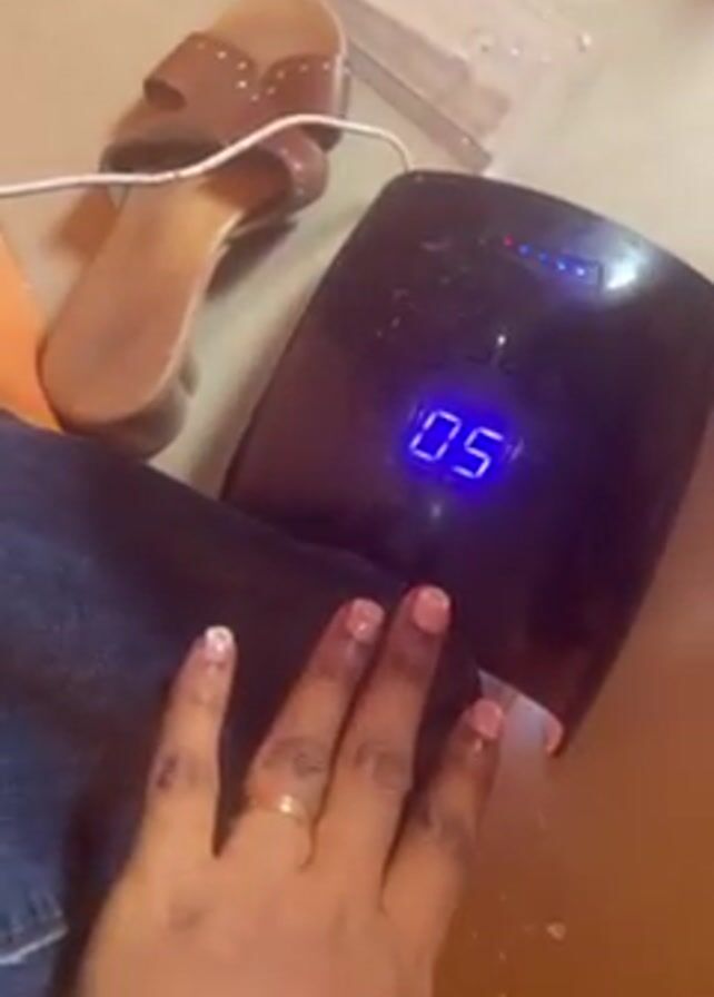 dark-skinned hand wearing a gold ring placed in a nail dryer
