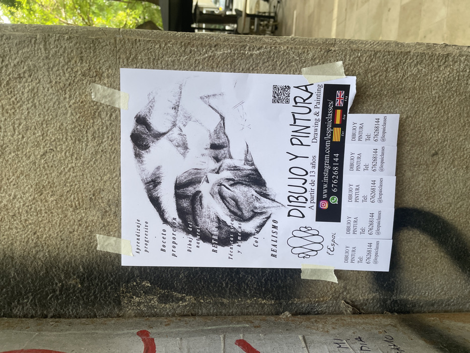 A vertically oriented white paper flyer, approximately A4 size, is adhered with four strips of light beige masking tape to a textured, weathered light beige-grey stone or concrete column in an urban outdoor setting. The flyer advertises "DIBUJO Y PINTURA" (Drawing & Painting) classes for ages "A partir de 13 años" (From 13 years old). The central image is a monochrome charcoal sketch depicting a human head in profile, appearing to be sleeping. Listed course topics to the left include "Aprendizaje progresivo," "Boceto y proporcion," "Dibujo del natural," "RETRATO," "Técnicas secas y húmedas," "Color," and "REALISMO," below which is a stylized "L'Espai" logo. At the bottom, a black bar contains an Instagram handle "@lespaiclasses," a WhatsApp number "676268144," and flags representing Catalonia (Estelada blava), Spain, and the United Kingdom, along with a QR code. The bottom edge features multiple tear-off tabs repeating "DIBUJO Y PINTURA," "Tel: 676268144," and "@lespaiclasses," with several tabs visibly removed. To the immediate left of the column, a darker, vertical surface shows red graffiti. The background to the right is out of focus, revealing green foliage from trees, a section of outdoor seating (table and chairs), and vehicles on a street under bright daylight. This scene is located in the city of Barcelona, Spain.