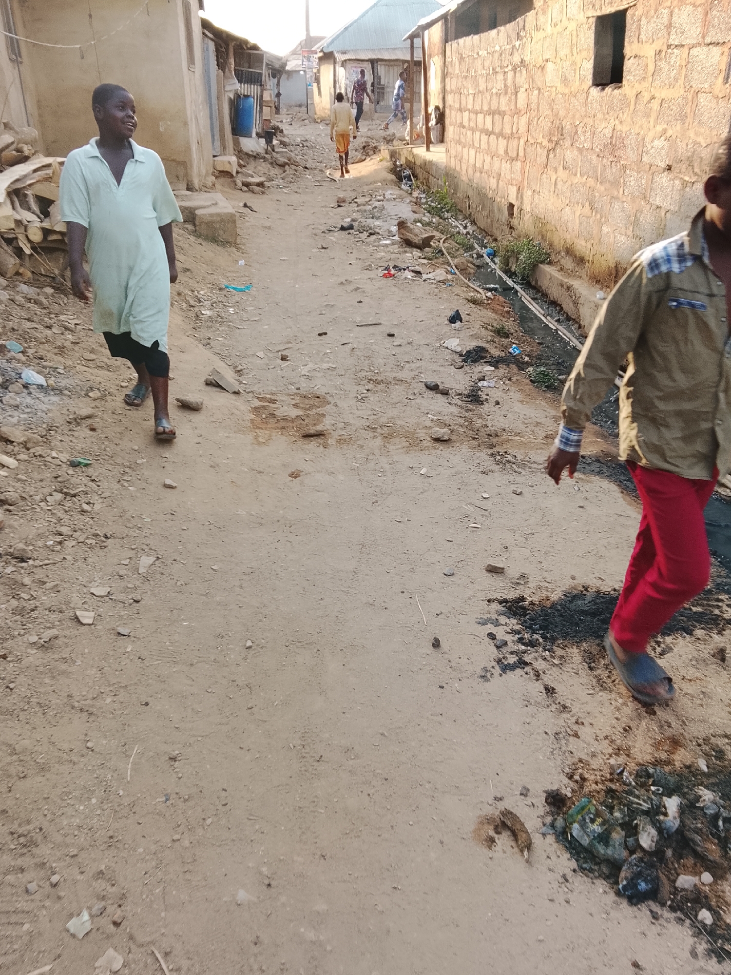 This image captures an unpaved dirt street within an informal settlement located in Abuja, Nigeria, under clear daylight conditions. In the left foreground, a young individual, likely a boy, walks towards the right of the frame, smiling and looking to the right. He wears a loose-fitting light green short-sleeved polo shirt, dark leggings, and dark sandals. His bare shins are visible. To the right foreground, partially cropped, another individual walks away from the viewer, attired in a khaki long-sleeved button-up shirt with blue and white plaid accents on the shoulders and cuffs, red pants, and dark sandals. Only their right side from the chest down is fully visible. The street surface is composed of compacted earth and sand, littered with small rocks, scattered pieces of plastic debris, and irregular dark stains. Along the left side of the street, several single-story structures are visible. These buildings are constructed from light-colored mud or concrete blocks, with some featuring corrugated metal roofs. Piles of wooden planks, rubble, and other discarded materials are stacked adjacent to these structures. A blue plastic barrel is identifiable in the mid-ground on the left. On the right side of the street, a wall constructed from rough-hewn stone blocks forms part of a building, featuring a single, open rectangular window aperture. Parallel to this wall, a narrow, open drainage channel contains stagnant dark liquid, interspersed with green vegetation and various items of refuse, including plastic bottles. Multiple other figures are discernible in the distant background, walking along the street amidst similar housing structures.
