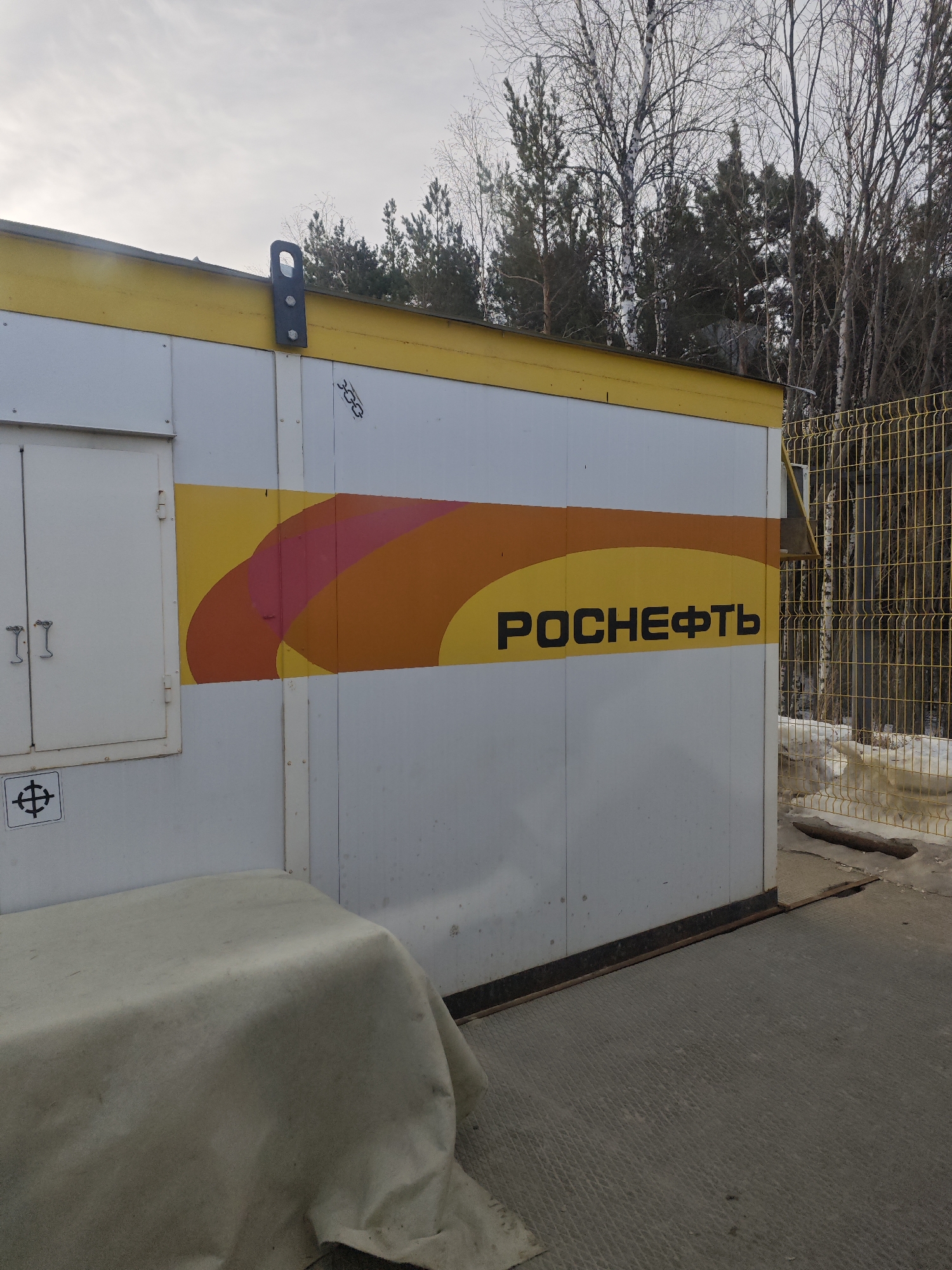 A photograph taken in an unknown city in Russia shows a white metal building with a yellow stripe near the top. The building's side is marked with the word "РОСНЕФТЬ" in black letters, alongside curved stripes of yellow, orange, and red. A yellow fence stands to the right of the building. A covering is draped over an object in the foreground. Trees are visible in the background. The sky is overcast.