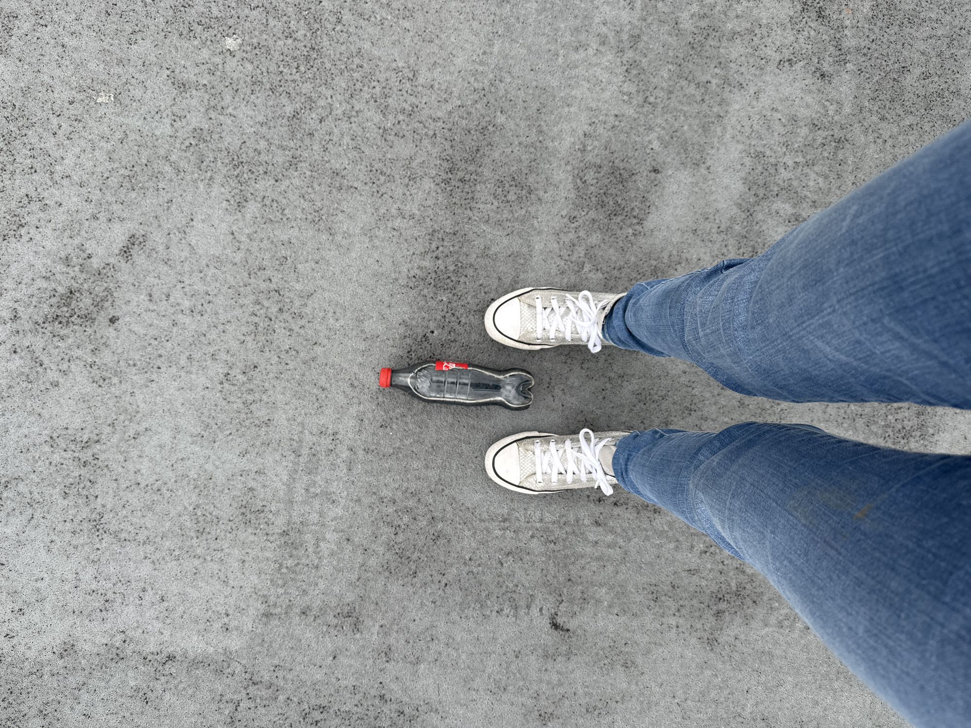 A high-angle shot shows a person wearing blue jeans and white Converse sneakers standing on a concrete surface. An empty, partially crushed Coca-Cola bottle with a red cap lies between the person's feet. The surface is predominantly gray with a textured appearance. The photo's location cannot be identified.