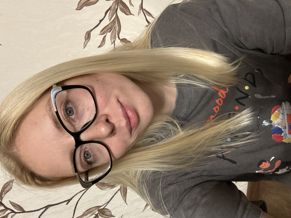 A close-up portrait depicts a blonde female individual, situated indoors in Voskresensk, Russia