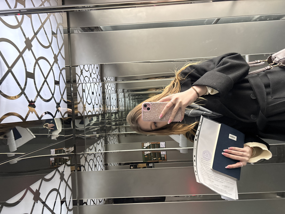 A young female, appearing to be in her late teens or early twenties, is depicted from the mid-torso upwards, standing inside an elevator and taking a mirror selfie. She has long, light brown hair and is wearing a black, belted long coat, a light-colored ribbed cuff on her left wrist, and a grey and white patterned scarf. Her nails feature a French manicure style with pink polish, and she wears rings on her right hand. In her right hand, she holds a rose gold-colored smartphone with a glitter case, angled to capture her reflection, obscuring part of her face. In her left hand, she holds a dark blue book or notebook, and a transparent document folder containing several white papers. One visible document displays a circular stamp featuring the Russian double-headed eagle emblem and Cyrillic text, including the word "УНИВЕРСИТЕТ" (University). The elevator interior features highly reflective stainless steel walls, creating multiple fragmented reflections of the subject and the internal environment. The elevator ceiling is illuminated and decorated with a white panel featuring an ornate geometric pattern of interlocking circles and lines. Visible in the reflections on the left elevator wall is a dark vertical panel displaying white Cyrillic text, which includes "Приёмная комиссия" (Admissions Committee) and the abbreviation "КГУ" (KGU), alongside a QR code and other information. This identifies the location as an elevator within Kuban State University (KGU) in Krasnodar, Russia.