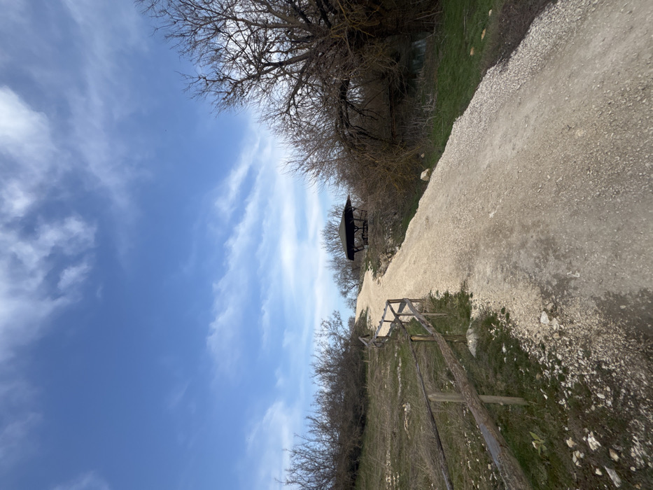 The image depicts an outdoor landscape in Lukovit, Bulgaria, under a clear blue sky with scattered cirrus and stratocumulus clouds. A light-colored, gravel-surfaced dirt path, approximately three meters wide, ascends from the foreground towards the upper center of the frame, curving slightly rightward. Along the left edge of the path, a rustic wooden fence constructed from unpainted logs and posts parallels the ascent, bordering a grassy slope with sparse, leafless bushes and dormant vegetation. To the right of the path, a dense line of trees and shrubs, predominantly bare and brown, extends upwards. A dark-roofed, octagonal or hexagonal wooden gazebo or shelter, featuring an open structure with visible dark benches, is situated on an elevated position to the right of the path, approximately two-thirds up the visible incline. Below the gazebo and to the right, a darker area suggests a body of water or stream, partially obscured by overhanging branches and dense shrubbery. Scattered small white rocks are visible on the path and surrounding ground. No individuals or animals are present.