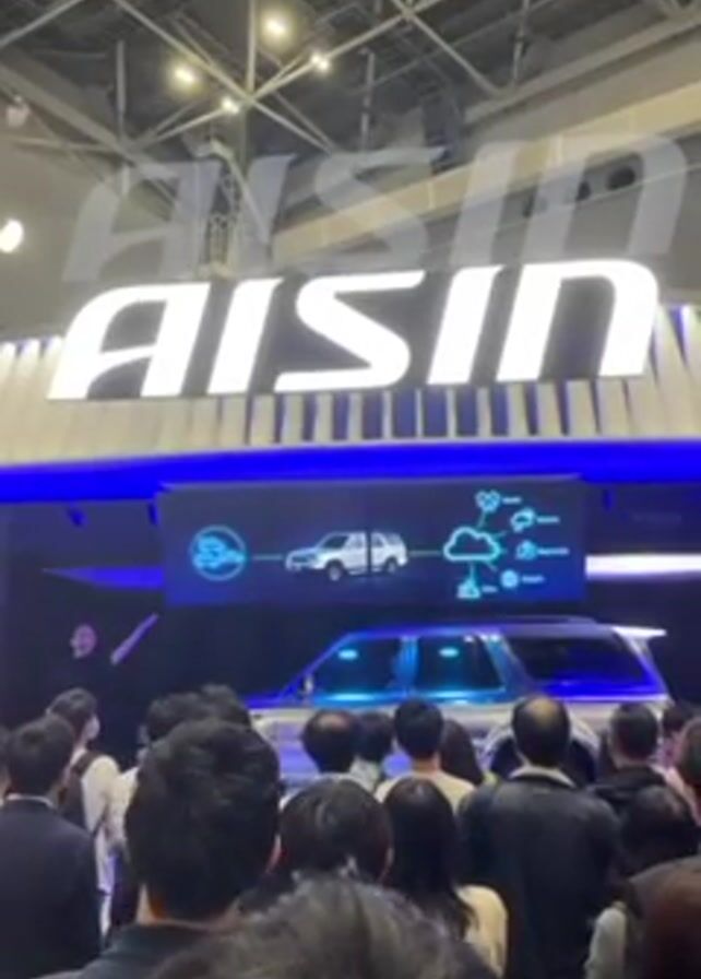 A crowd of people stand facing the camera at what appears to be a trade show or convention. Overhead, the AISIN logo is prominently displayed in bright white lettering. Below the logo, a wide screen shows a white SUV connected by lines to a cloud icon and a steering wheel icon. A real silver SUV sits below the screen with a blue glow emanating from beneath it. The lighting is bright overhead and appears to be indoor lighting. Most of the people in the crowd have their backs to the camera and are observing the display. The overall impression is that the video shows a demonstration of automotive technology being presented at a trade show by the company AISIN.