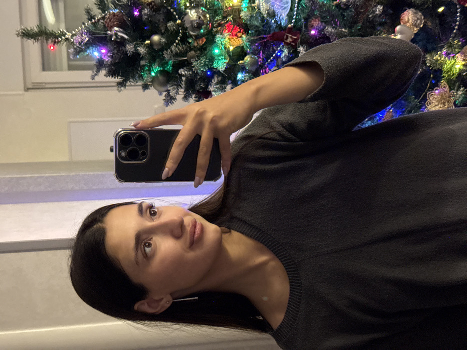 - "A woman with dark hair and a gray sweater takes a selfie with her smartphone in front of a Christmas tree decorated with lights and ornaments" by FM-fSbZr2, licensed under CC BY 4.0