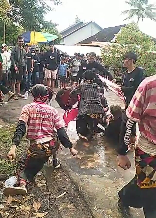 A group of people are gathered in an outdoor location, possibly a village, with some individuals engaged in a performance of a traditional dance or martial art. The setting is somewhat rustic, with what appears to be a wet, paved surface. Several people are positioned as onlookers, and some are actively involved in the performance, wearing traditional attire. A green and yellow flag stands amongst the crowd. The movements of the performers are energetic and dramatic, with the focus appearing to be on the central actions occurring on the ground.