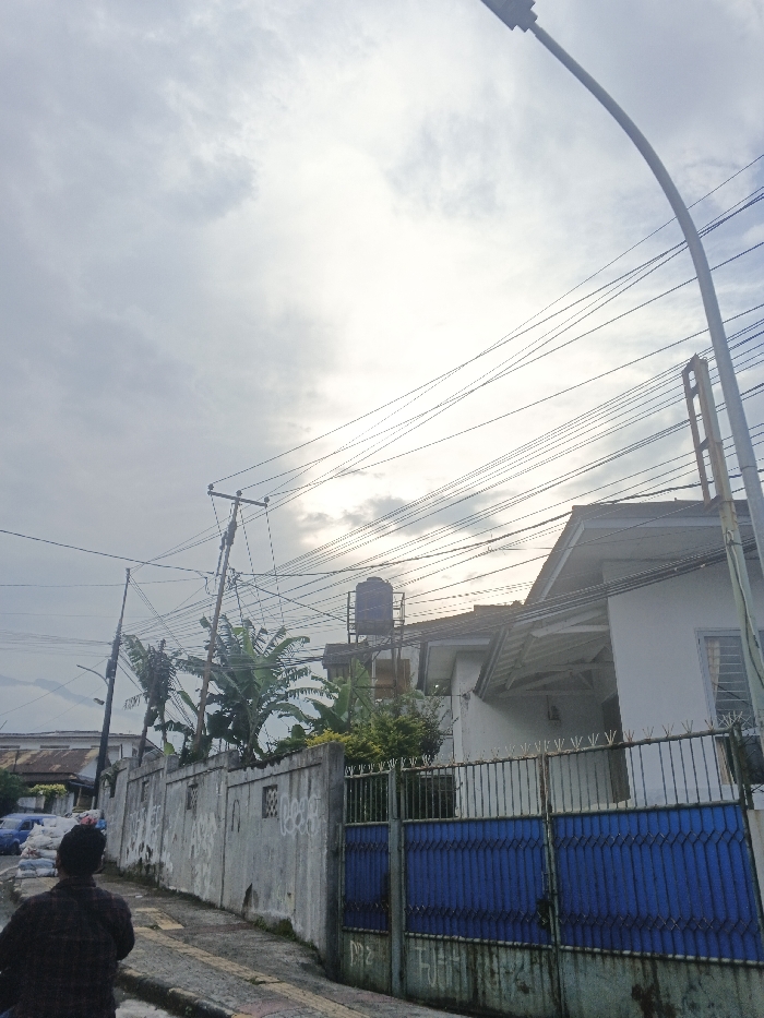 The image captures a daytime street scene in Kon Tum, Vietnam, under an overcast sky with a bright area indicating the sun's position. In the left foreground, the back of a person's head and shoulders, wearing a dark, possibly checkered shirt, is visible as they walk away from the viewer on a concrete sidewalk. To the right of the person, a weathered concrete wall, approximately head-high, extends into the midground, covered in patches of white graffiti, including the numbers "0888". Behind this wall, lush green foliage and several banana trees are visible. In the midground-right, a large, dark blue metal gate with a prominent geometric pattern stands closed, topped with a row of pointed spikes. The lower section of the gate shows signs of weathering or corrosion. Behind the gate, a white residential house with a dark-tiled, sloped roof is partially visible. Further back and slightly to the left of the house, a dark blue water tank mounted on a metal stand is present above the roofline. Numerous black utility wires crisscross the upper portion of the frame against the sky. Multiple utility poles are present; one prominent pole with several cross arms laden with wires stands in the midground-left, and a curved, grey street light pole extends into the frame from the far top-right. In the distant background on the left, additional buildings and what appear to be parked vehicles, including blue cars, are faintly discernible. The overall environment suggests an urban or suburban setting with a mix of residential structures and infrastructure.