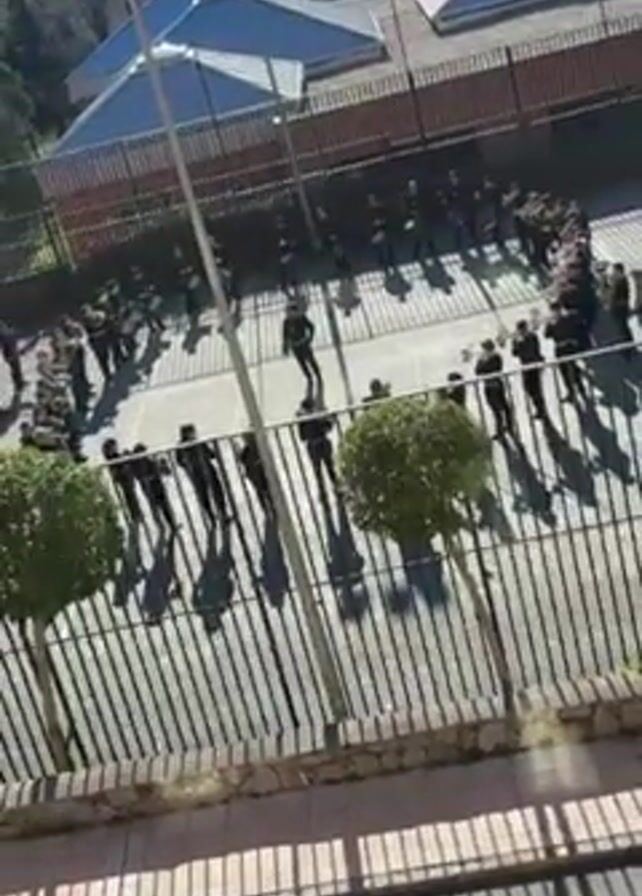 A high-angle view shows a marching band in black uniforms standing in formation on a light-colored court, enclosed by a chain-link fence. Two small, round trees are at the bottom of the frame, near the fence. Sunlight casts long shadows from the fence and the people. The band is arranged in a semi-circular shape, with a person in uniform standing at the open end. The band members are holding and potentially playing instruments, including drums and trumpets. Buildings with peaked roofs and traditional apartments can be seen in the background. The sky is clear and blue.