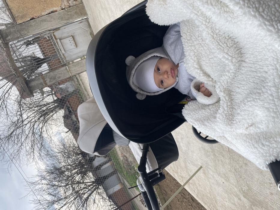 The image depicts a young infant seated in a dark-colored baby stroller on a concrete surface outdoors in Tarnava, Bulgaria