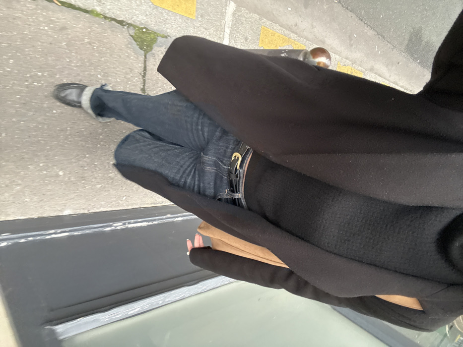 A person wearing dark denim jeans, a black top, and a long black coat stands on a sidewalk. A black shoe is visible on the left. The person is also holding a tan-colored handbag. A window or reflective surface is in the foreground, possibly a store window. Yellow markings appear on the sidewalk's edge. The image is taken from a high angle, looking down at the person.