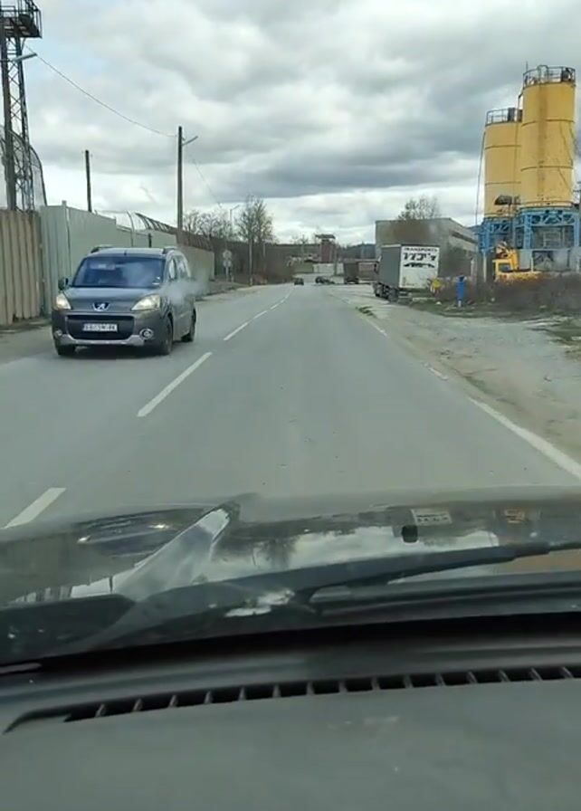 A vehicle travels down a two-lane road on an overcast day. To the left of the road is a tall chain-link fence. To the right are large yellow concrete silos and several parked trucks. Smoke drifts from behind some trees in the distance. Another car passes on the left. The road surface appears cracked or dusty. The wiper blades of the vehicle are visible in the lower part of the frame. The sky is gray with thick clouds.