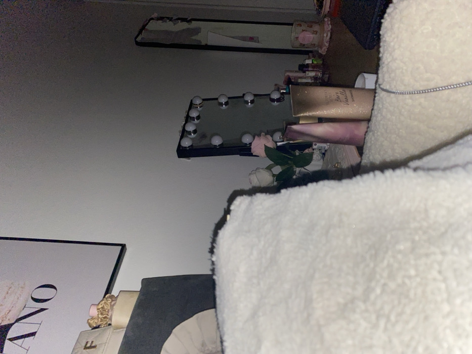 A tilted view shows a room with a framed print displaying the word "MILANO" vertically. Above, a mirror with lights is partially visible, alongside two tubes of lotion. Flowers in a vase sit next to the mirror. At the top of the image, another mirror is mounted. The foreground is dominated by a white, fluffy material, obscuring much of the scene.