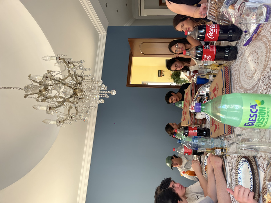A group of people sit at a table laden with beverages, including Coca-Cola, Fresca, and Corona beer. The table is covered with a patterned tablecloth. A pizza box is also visible. Above, a large crystal chandelier hangs from the ceiling. The wall is painted a bluish-gray color. A doorway can be seen in the background. The overall impression is of a casual gathering or meal.