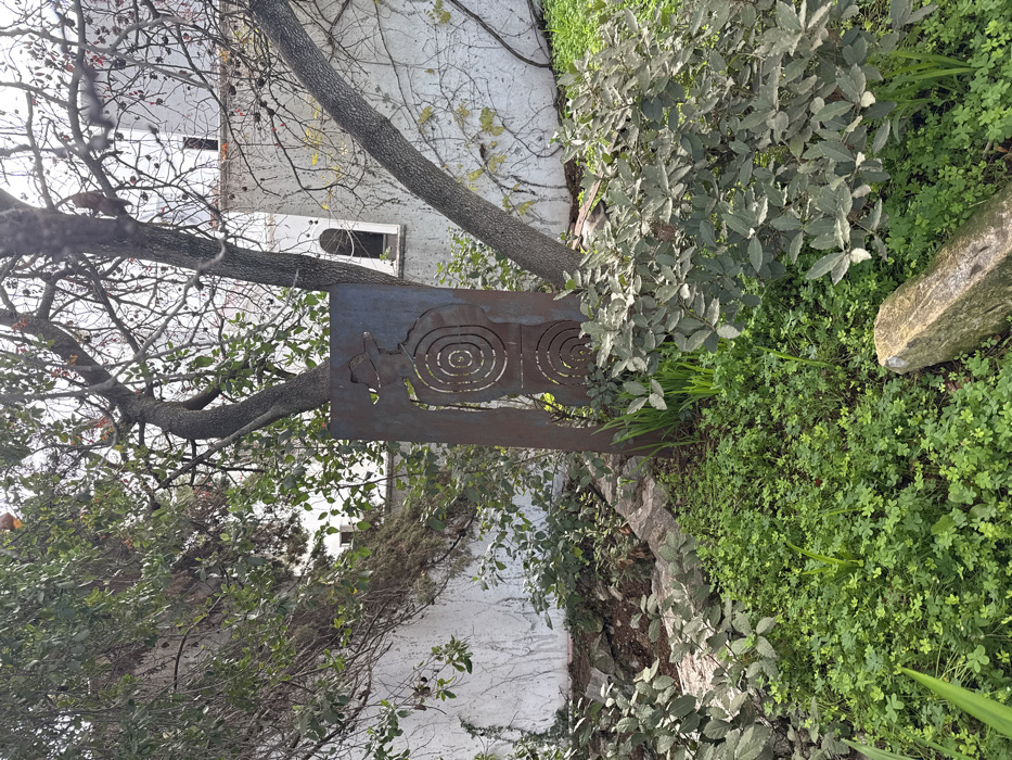 An abstract metal sculpture featuring two concentric circles is positioned amongst greenery, with a tree trunk bisecting it. The sculpture also includes a cutout of a snail. A stone and various plants, including clovers, surround the base of the sculpture. A white building is visible in the background, partially obscured by tree branches. The scene gives the impression of a garden or outdoor art installation.