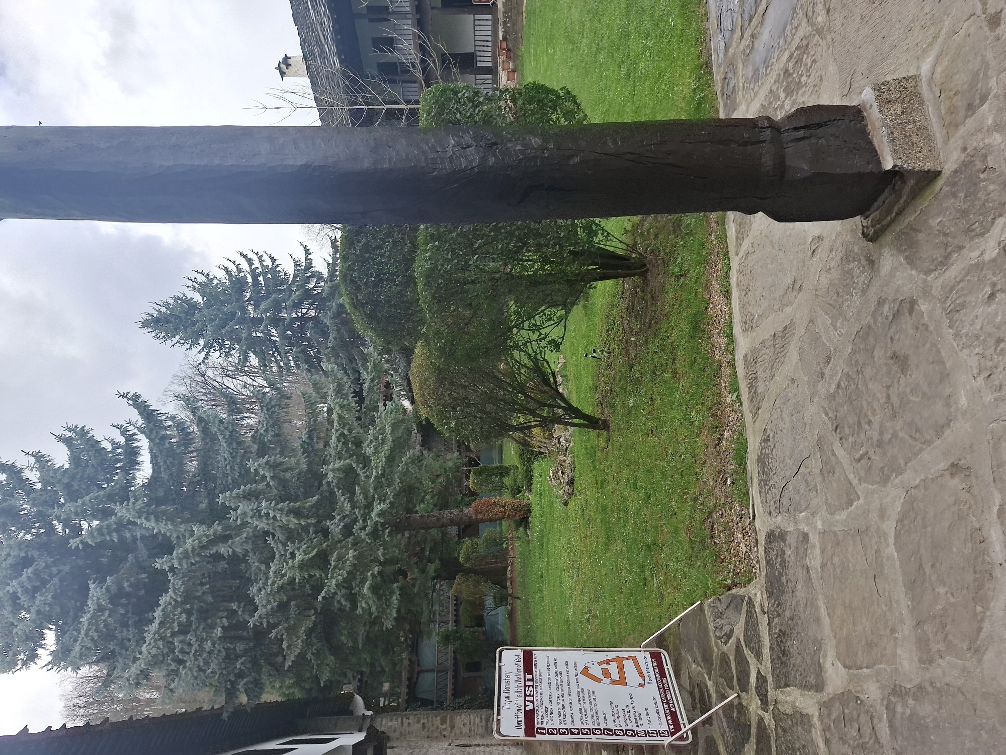 view of the grounds of the Troyan Monastery in Oreshak, Bulgaria. A dark wooden post is in the foreground, mounted on a stone base. In the background, there is a green lawn, bushes, trees, and a stone pathway. A sign with information for visitors is visible in the lower part of the frame. The weather appears overcast.