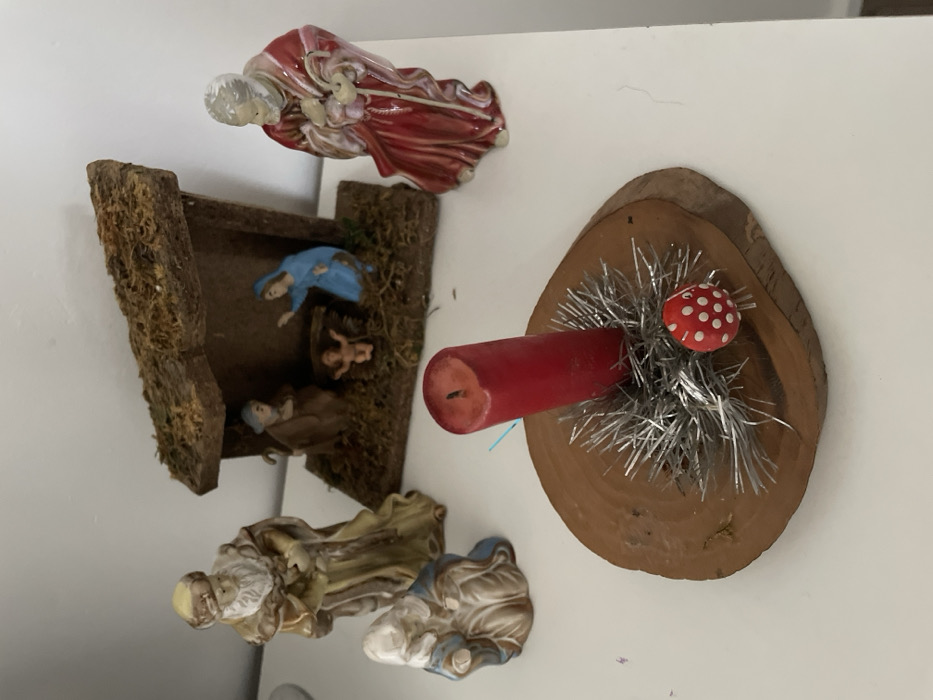 This image depicts a Christmas nativity scene and a decorative candle arrangement displayed on a white surface in Strasbourg, France