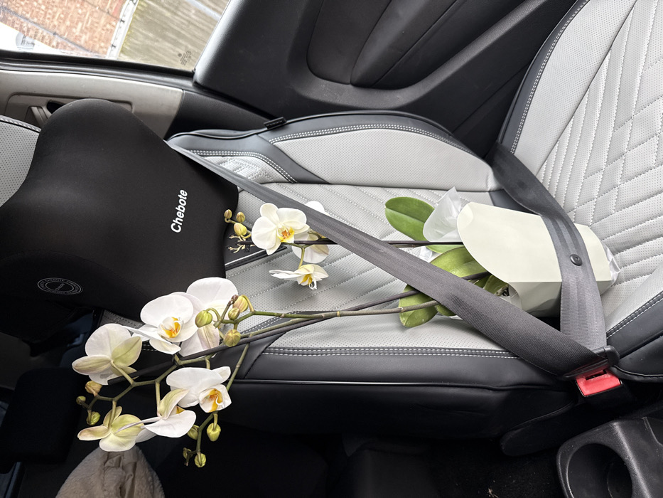The scene captures the interior of a vehicle, specifically the front passenger seat area. A potted Phalaenopsis orchid, displaying numerous white flowers with yellow centers and green leaves, rests on the light grey and dark grey two-toned passenger seat. The plant's light-colored, geometric pot, partially wrapped in white tissue paper, is secured by the vehicle's grey seatbelt, which is buckled across its base. The seat features quilted and perforated upholstery patterns. A black neck pillow, branded "Chebote," is visible on the upper part of the seat's headrest. No individuals are present. Through the passenger window, a blurred exterior environment shows the texture of a brick building, suggesting an urban or residential setting. The specific location within London, United Kingdom, is not discernible from the image.