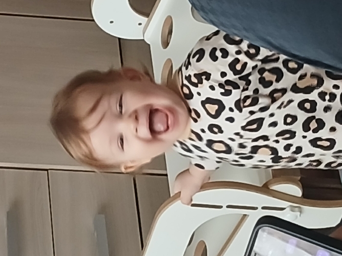 A young child, approximately one to two years old, with light brown hair, is depicted mid-laugh, mouth wide open, and eyes narrowed. The child wears a short-sleeved, leopard-print top in black, brown, and off-white. The child's left hand grips a piece of white and natural wood-toned furniture, possibly a play structure or crib, featuring cut-out designs. In the lower-left foreground, a dark electronic tablet or smartphone is partially visible. A segment of a human leg, dressed in blue denim, is present on the right. The background consists of a light brown wooden dresser or cabinet with multiple drawers and horizontal metallic handles. The scene is set indoors, within a domestic environment in Krasnodar, Russia.