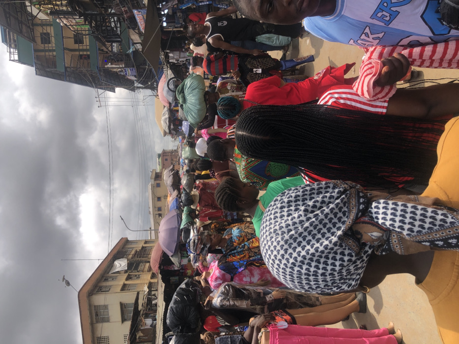 The scene depicts a crowded outdoor market in Fegge, Nigeria, under an overcast sky