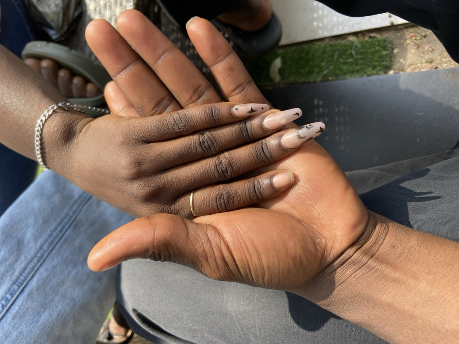 The image displays a close-up view of two human hands, located in Barakin Lerawi, Nigeria, under direct sunlight. A darker-skinned hand, presumed to be female, is positioned palm-down, resting upon the open palm of a second, lighter-skinned hand, presumed to be male. The upper hand features long, almond-shaped artificial nails with a translucent base, each adorned with black star and crescent moon designs. A thin, plain gold-colored band ring is present on the ring finger of the upper hand, and a silver chain link bracelet is visible on its wrist. The lower hand exhibits short, natural nails. Partial clothing is visible: light blue denim fabric is behind the wrist of the upper hand, and dark grey fabric is beneath the lower hand. The background shows blurred elements consistent with an outdoor environment, including green vegetation and light-colored ground surfaces, with prominent shadows indicating strong illumination.