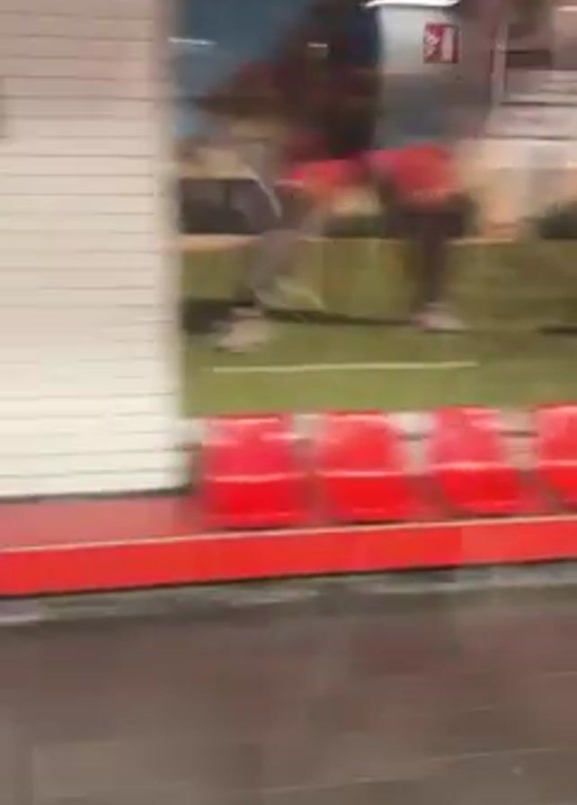 interior of a subway car moving along a track. The camera is positioned inside the train, looking out of the window at a subway station platform. Red benches and advertisements are visible on the platform. As the train stops, the view shifts to the interior of the train, showing several passengers boarding. People are wearing various casual clothing items such as jackets, sweaters, and jeans. Some are looking at their phones. The video is somewhat shaky.