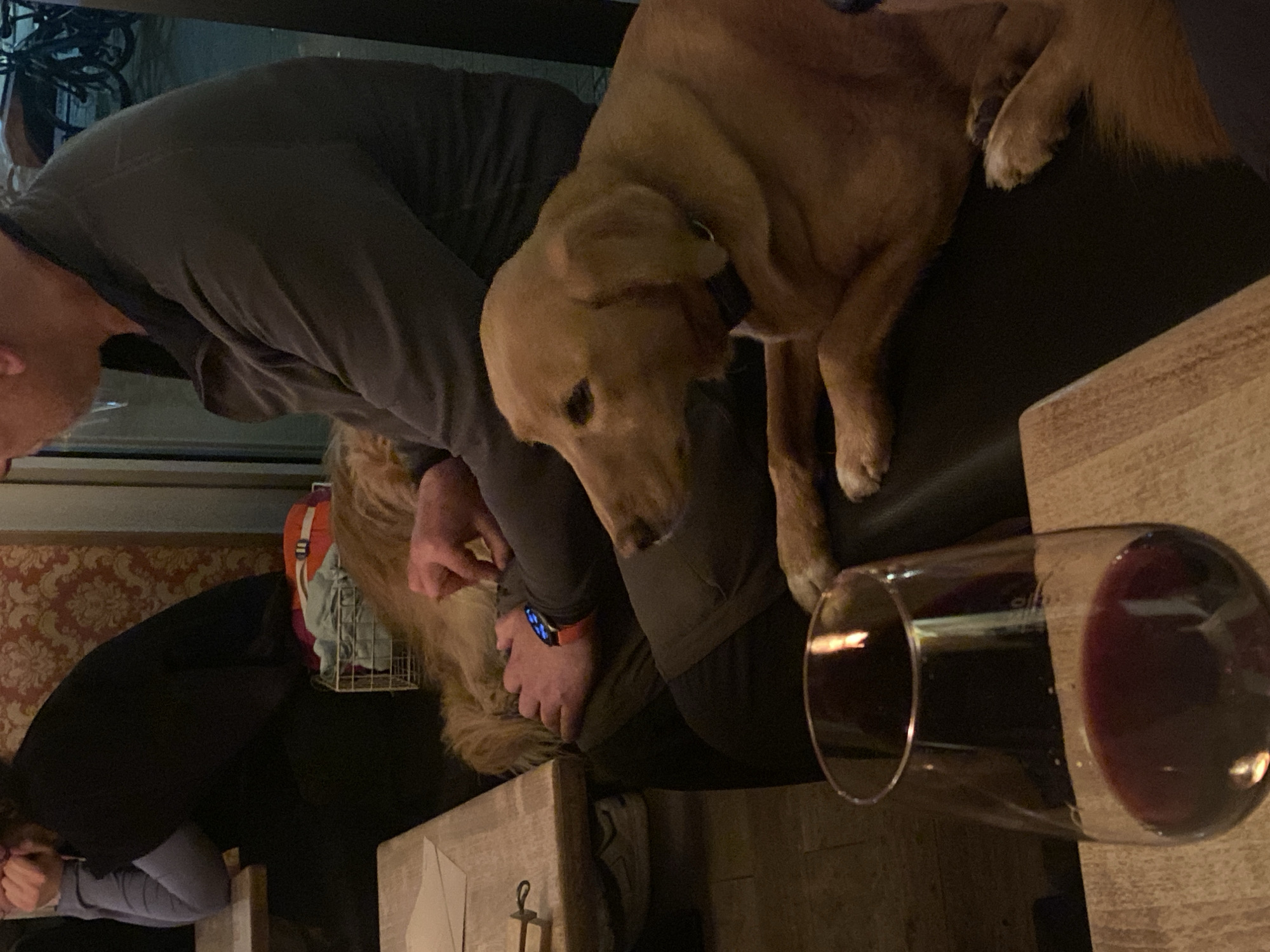 A rotated indoor scene depicts a seated person in a gray long-sleeve shirt with a golden retriever lying on their lap, likely at a restaurant in Heidelberg, Germany. A glass of red wine sits on a wooden table in the foreground. The individual has a watch with an orange band on their wrist. Another person is seated to the left, wearing dark pants and a light gray long-sleeve shirt. Wallpaper with a red and gold floral pattern is visible in the background.