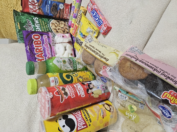 - "The image displays an array of packaged snack foods and beverages arranged on a light-colored, textured fabric surface, consistent with a sofa or cushion, in Kathu, Thailand" by FM-LRaJ52, licensed under CC BY 4.0