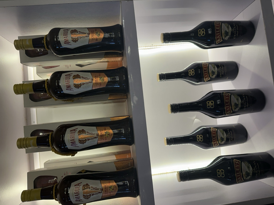 - "This image depicts an indoor retail display within Gwarinpa, Nigeria, showcasing bottles of cream liqueur on two illuminated white shelves" by FM-UL3Xh1, licensed under CC BY 4.0