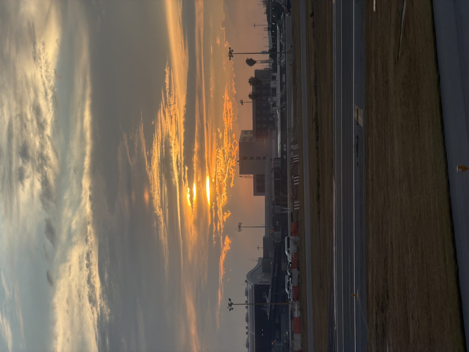 An image depicts a sunset scene at what appears to be an airport. The sun is partially obscured by clouds, creating a vibrant orange and yellow glow. Below the sky, there is a runway, buildings, and some vehicles. Light posts are scattered throughout. The overall scene is serene, with warm colors dominating the sky.