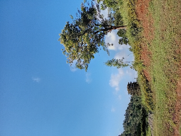 A landscape scene presents a vibrant blue sky dominating the upper half. A large tree with dense green foliage is partially visible against the sky. The lower half transitions into a hillside covered in grass and vegetation, sloping upward. Additional trees and greenery fill the background, creating a natural, serene setting. The scene is bright and appears to be captured on a clear, sunny day.