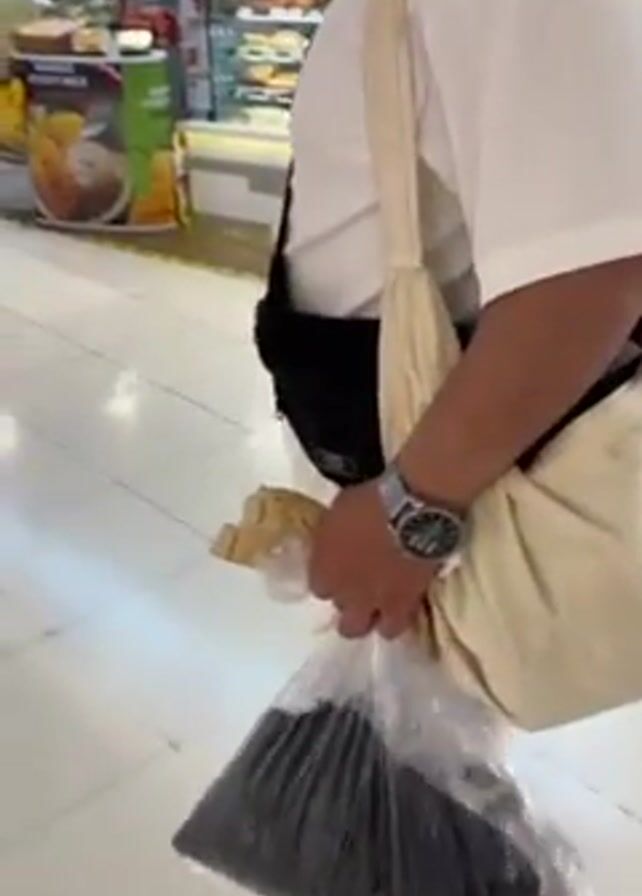 A man is walking to the right across a white tiled floor, carrying a plastic bag with dark items in it. He also has another bag slung over his shoulder. He wears a white shirt, white shorts, and black and white shoes. There are shops and displays behind him. One sign says "KOH HOP BAR." He is also wearing glasses and a wristwatch. He seems to be chewing something.