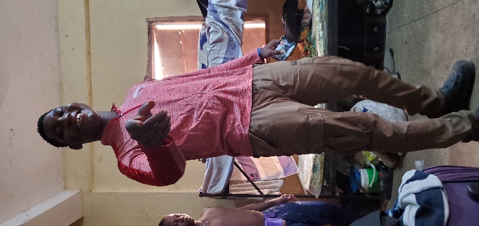 A person in a red shirt and khaki pants stands in a room, holding a cell phone, and gesturing with his hand. Another person is lying on the floor near the bottom of the image. Behind the standing person are some furniture and curtains. The floor and walls are light-colored. There's a suitcase and some other belongings in the lower right corner.